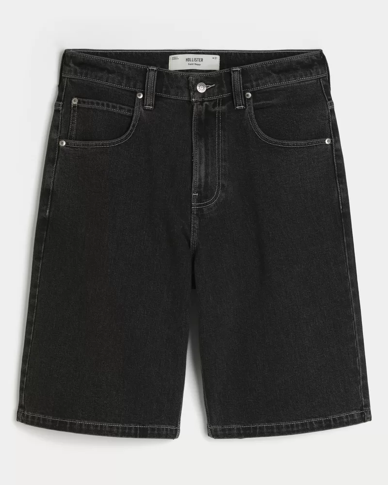 Comfortable denim shorts in a washed black, designed with a super baggy leg that hits below the knee. Embroidered cat graphic at back pocket. Imported.