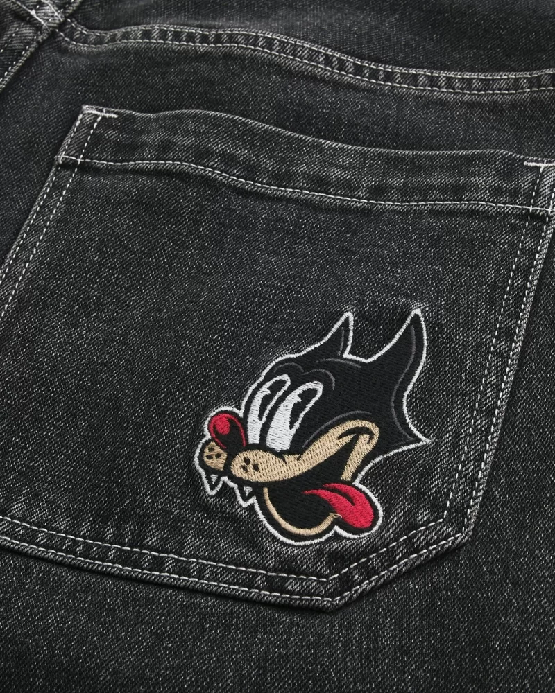 Comfortable denim shorts in a washed black, designed with a super baggy leg that hits below the knee. Embroidered cat graphic at back pocket.