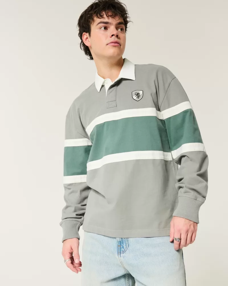 A long-sleeve rugby polo in heavyweight 100% cotton fabric with stripes and an embroidered left chest icon detail. Collar, button placket. Boxy Fit. Imported.
