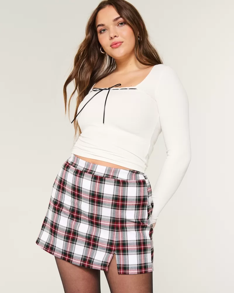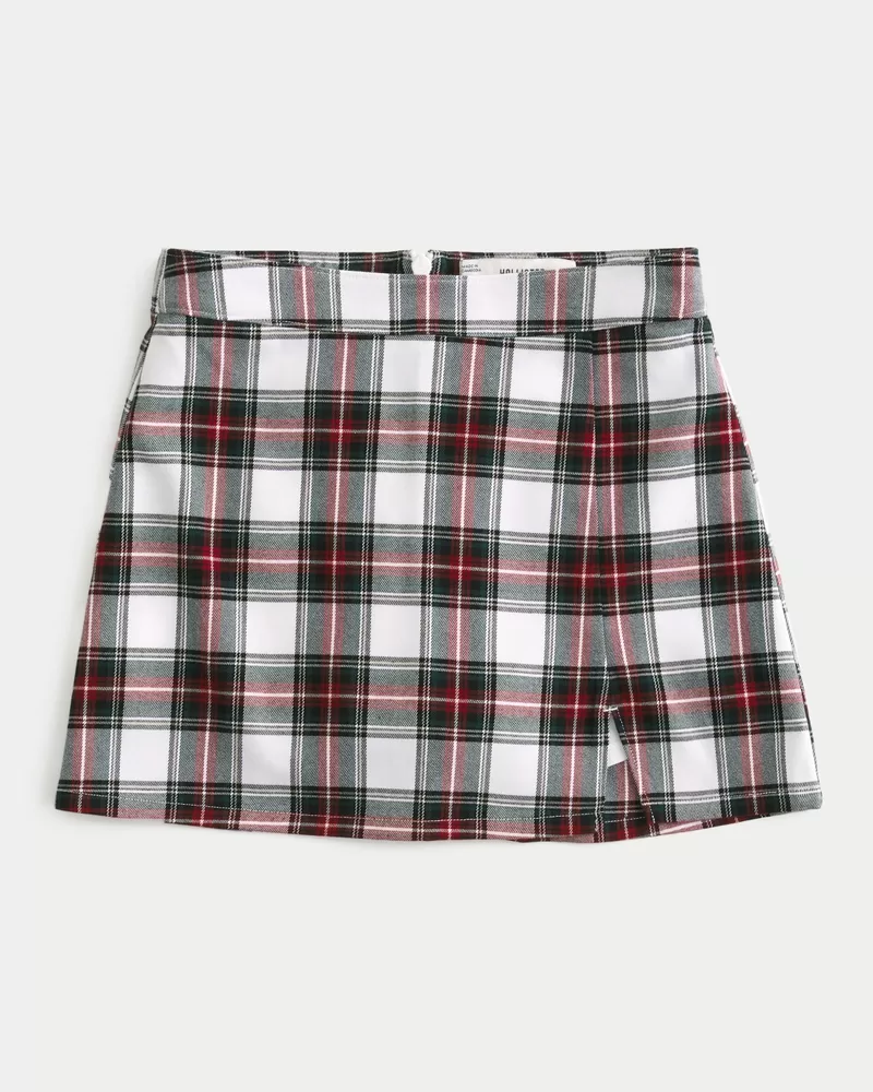 A super cute skort designed with an a-line silhouette and ultra high-rise waist. Hidden knit shorts, hem notch detail, back zipper closure. Imported.