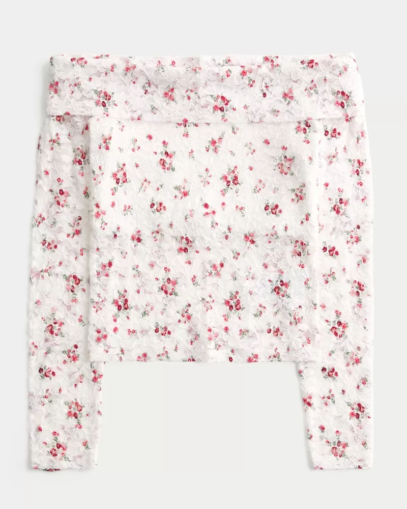A pretty and super soft top in all-over lace with long sleeves and a foldover off-the-shoulder neckline. Interior lining at bust. Imported.