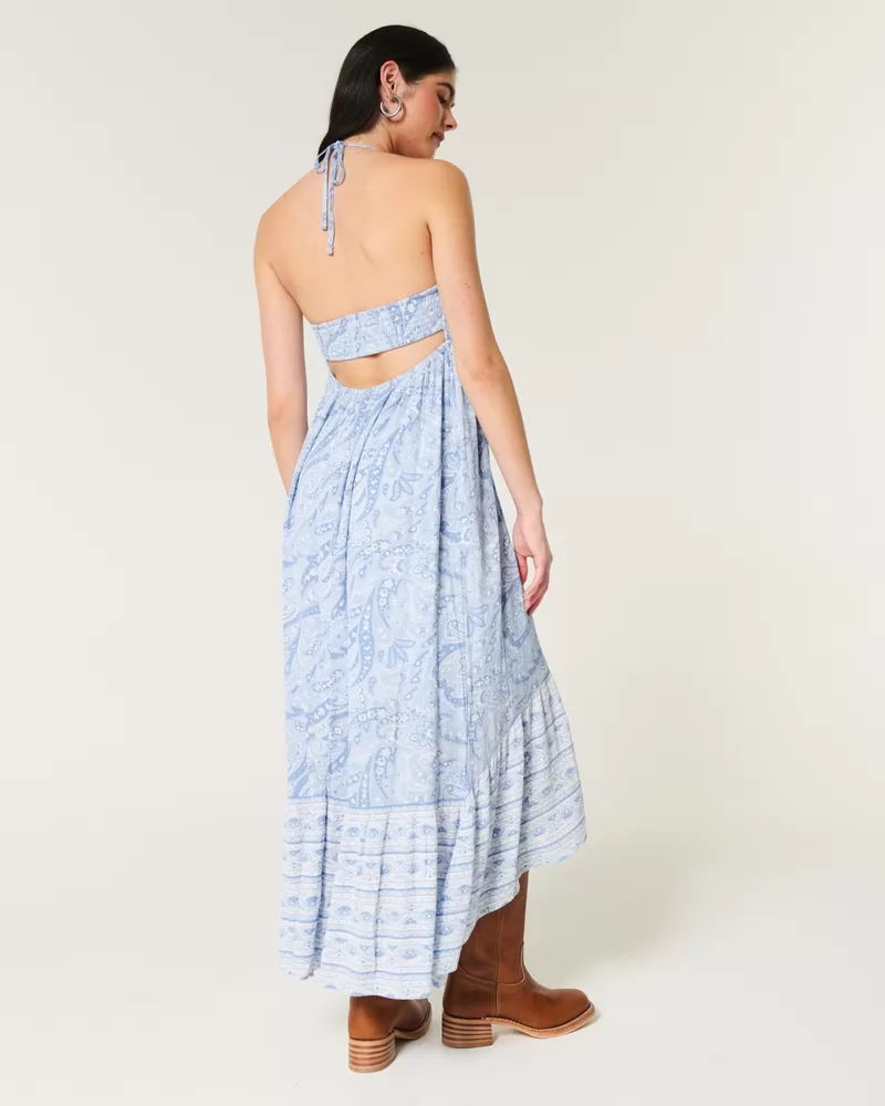 This super soft and flowy maxi-length dress has removable pads and pockets. Whimsical asymmetrical hem, adjustable halter straps, split hem detail. Imported.