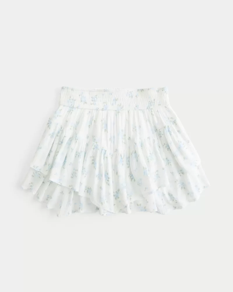 This pretty and super soft mini skort features a soft smocked waist and tiered asymmetrical hem. Hidden shorts, pockets, mid-rise waist. Imported.