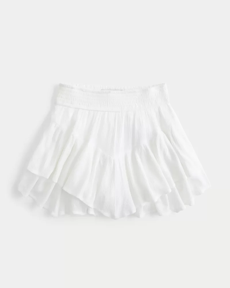 This pretty and super soft mini skort features a soft smocked waist and tiered asymmetrical hem. Hidden shorts, pockets, mid-rise waist. Imported.