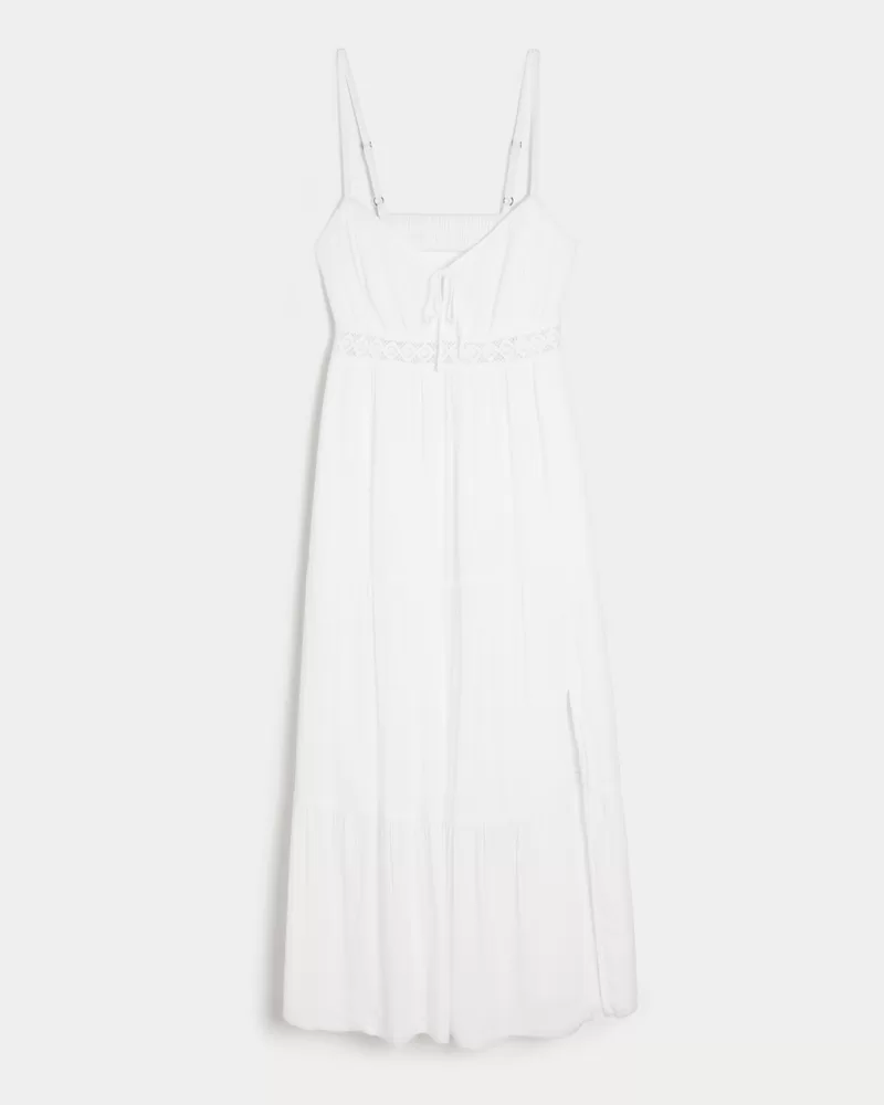 Flowy and super soft, this dress features a babydoll silhouette, center tie detail, lace-detailed waist, scrunch back detail and pockets. Split hem detail. Imported.