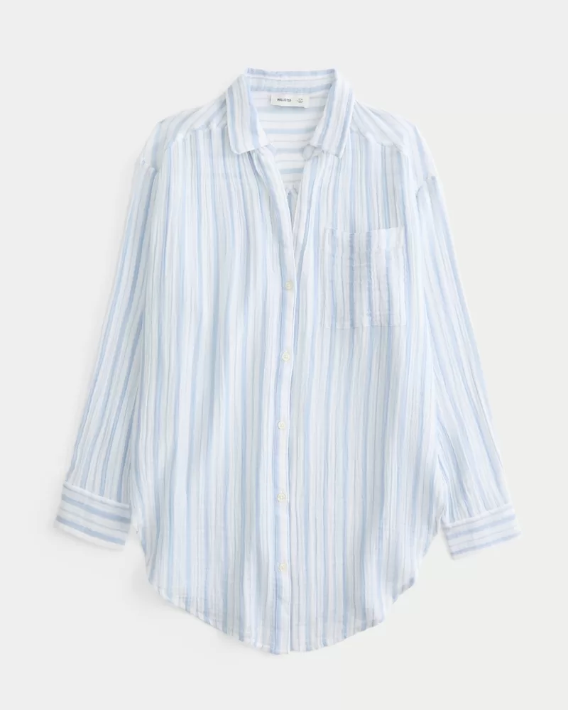 A pretty and super soft cover up shirt dress with a full button closure. Left chest pocket, collar, long sleeves, curved hem. Imported.