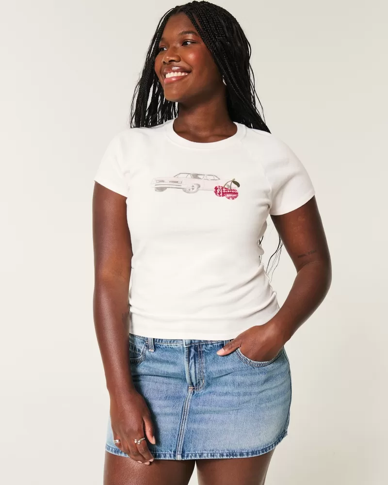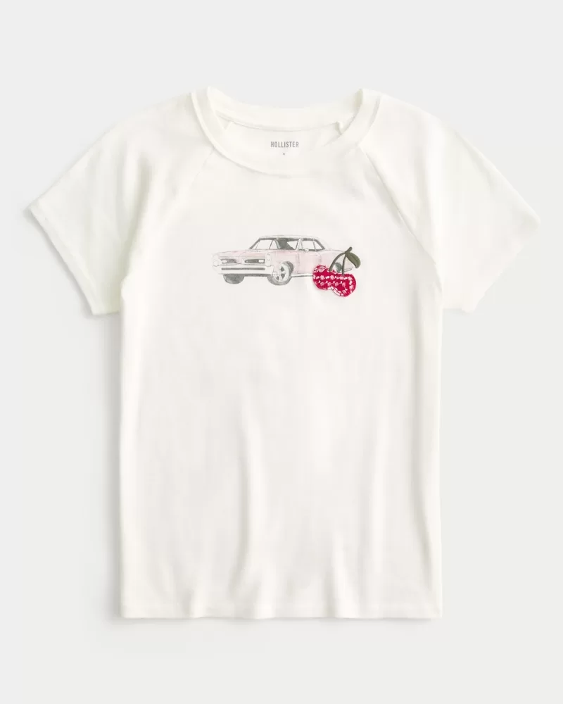 A super soft 100% cotton baby tee designed with a slightly shrunken silhouette. Car print graphic with embroidered cherry detail. Crew neckline, short sleeves. Slim Fit. Imported.