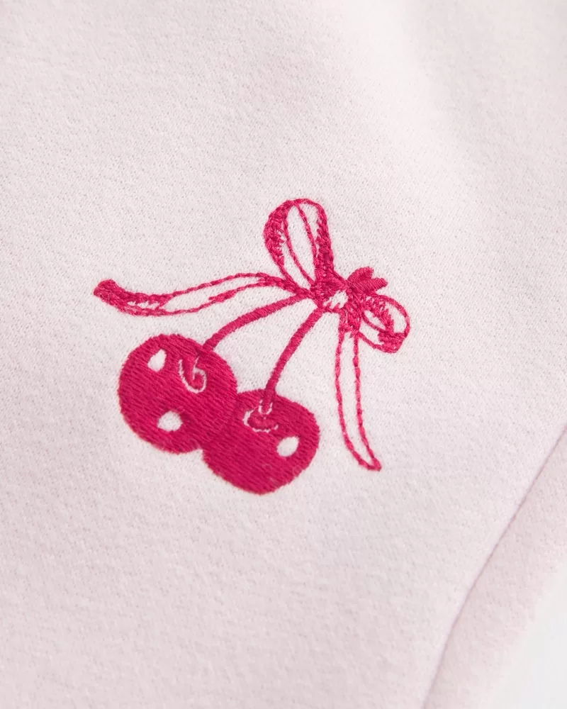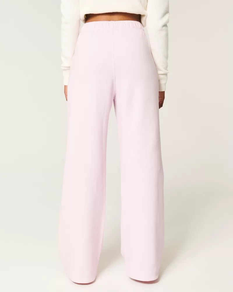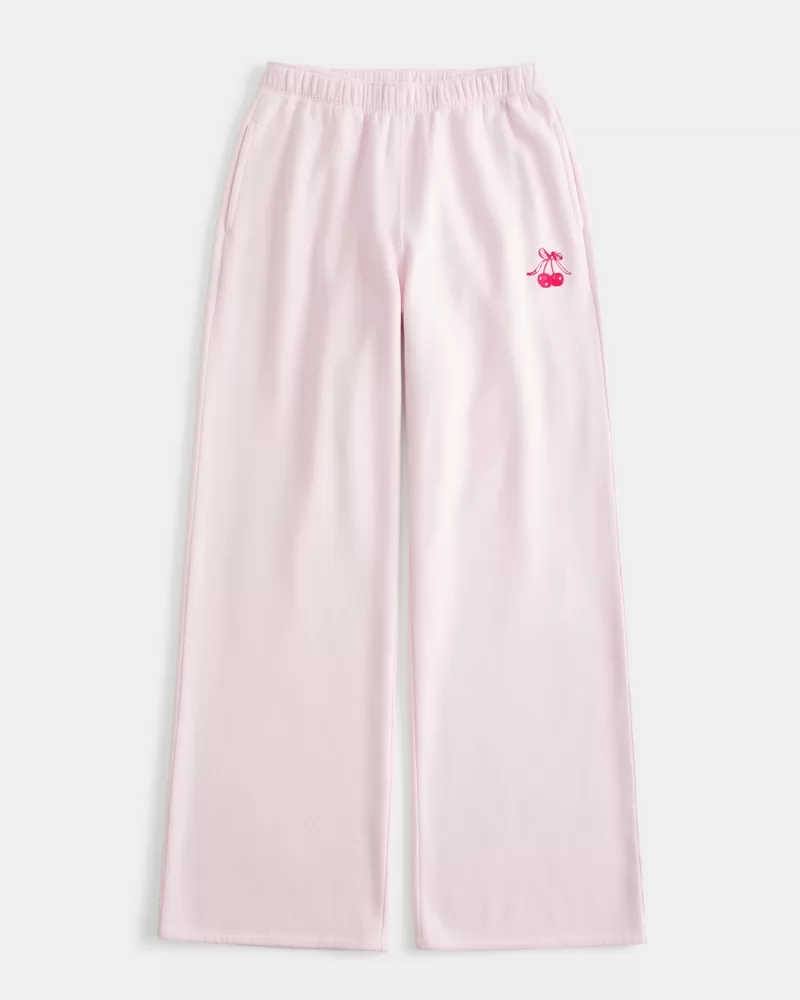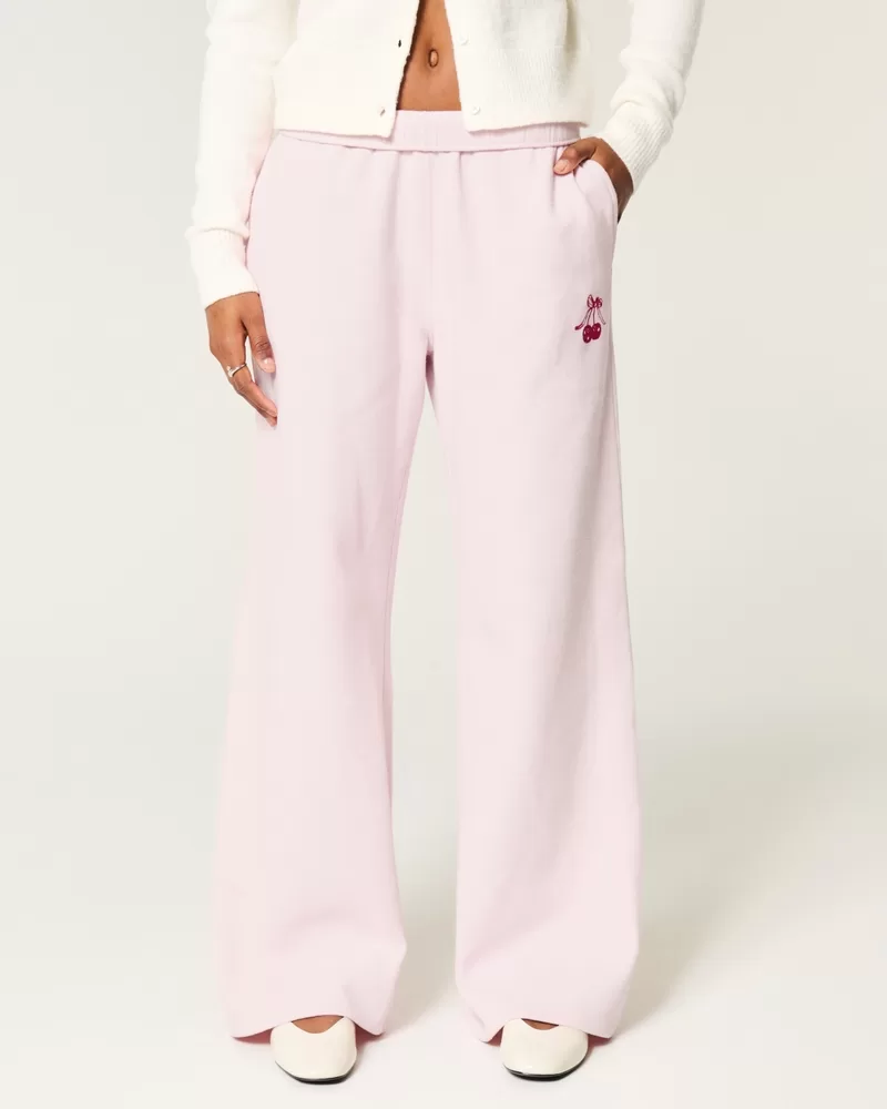 Super soft fleece sweatpants designed with a wide-leg silhouette. Banded ultra high-rise waist, pockets, cherry graphic embroidery. Imported.