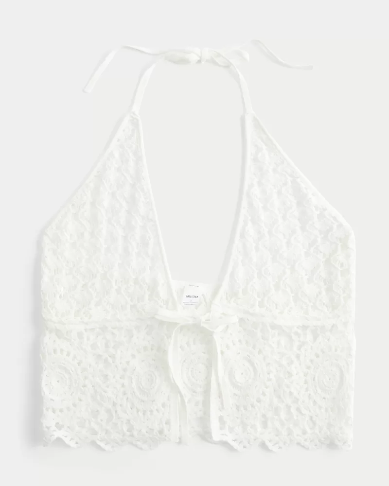 This cute swim cover up top is made with soft crochet-style fabric and features a tie-front closure and all-over stitched patterns. Halter straps, open back. Imported.