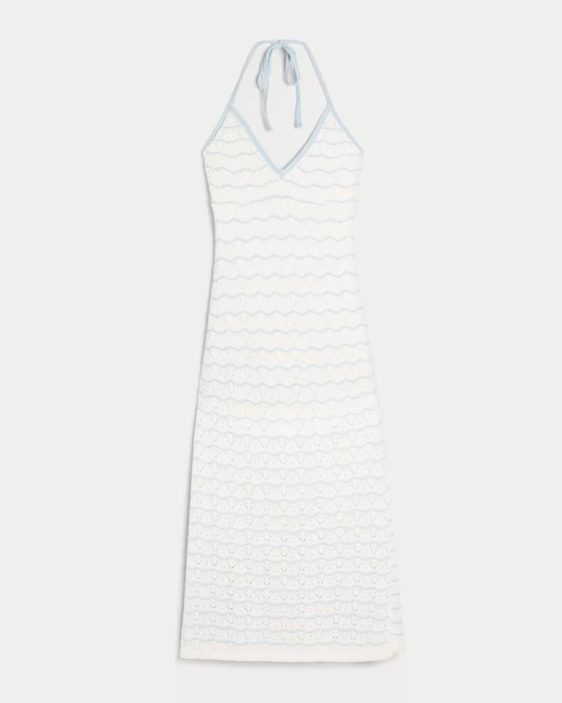 This pretty midi-length dress is made with super soft crochet-style fabric and features all-over stitched patterns. Halter straps tie at back. Imported.