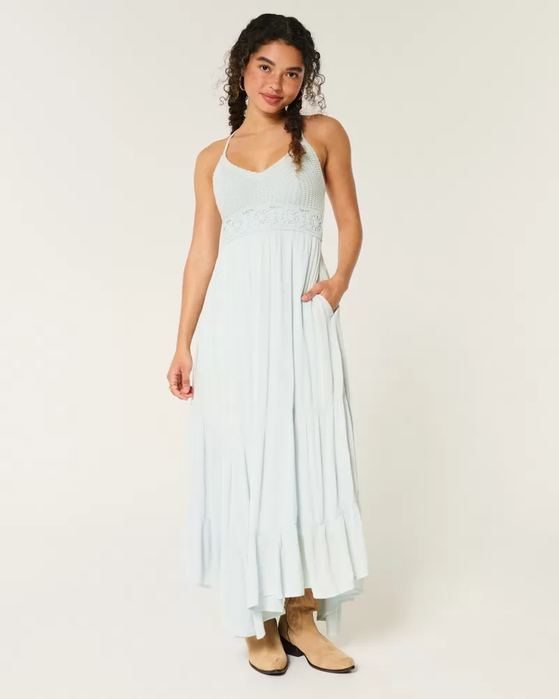 This pretty maxi-length dress features fabric mixing with a super soft crochet-style bodice and flowy woven skirt. Cute stitched patterns, asymmetrical hem, v-neck, adjustable cross-back straps, pockets. Imported.