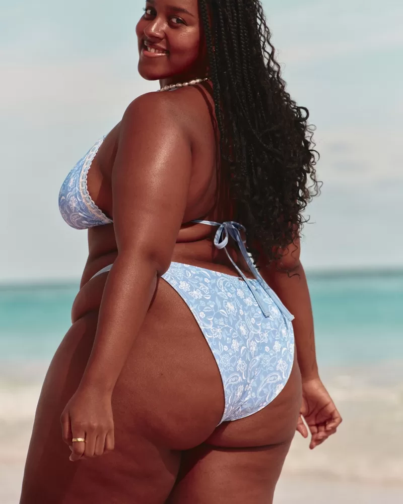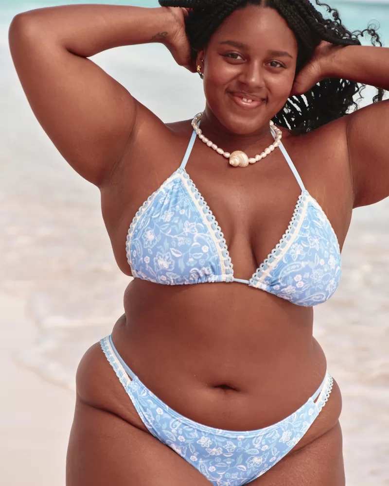 A super cute bikini top with a mix of soft swim fabric and crochet-style edge trim. Triangle silhouette with halter straps, removable pads, tie back straps.