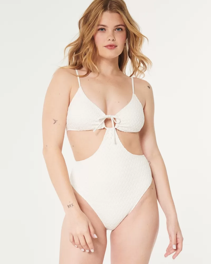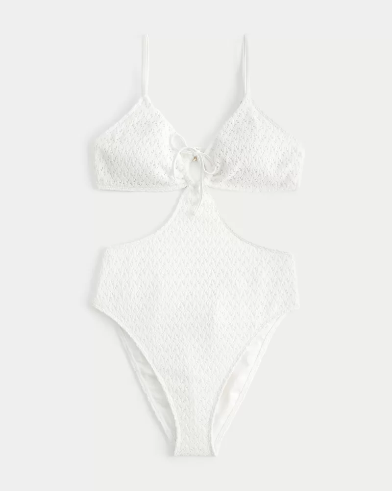 A cute and comfy one-piece swimsuit made with soft crochet-style swim fabric, featuring side cutout details and a high-leg cheeky silhouette. Adjustable straps, swan hook closure, scoop neckline, front tie detail. Imported.