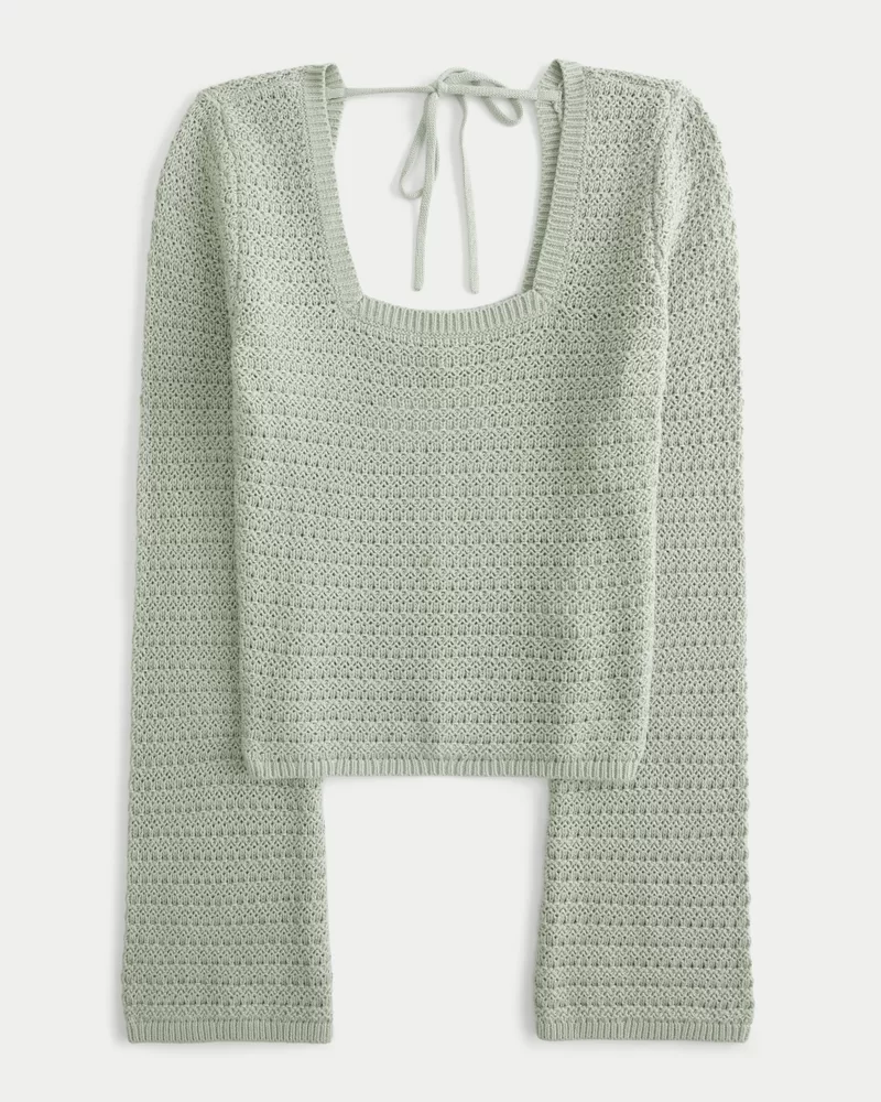 A cute and cozy top in super soft crochet-style fabric with a square neckline and back tie. Long sleeves. Imported.