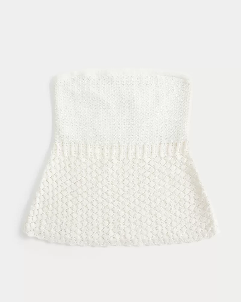 A super soft crochet-style sweater tube featuring an inner lining at the bust. Slim-fitting through the bust with a looser babydoll silhouette around the waist. Strapless. Slim Fit. Imported.