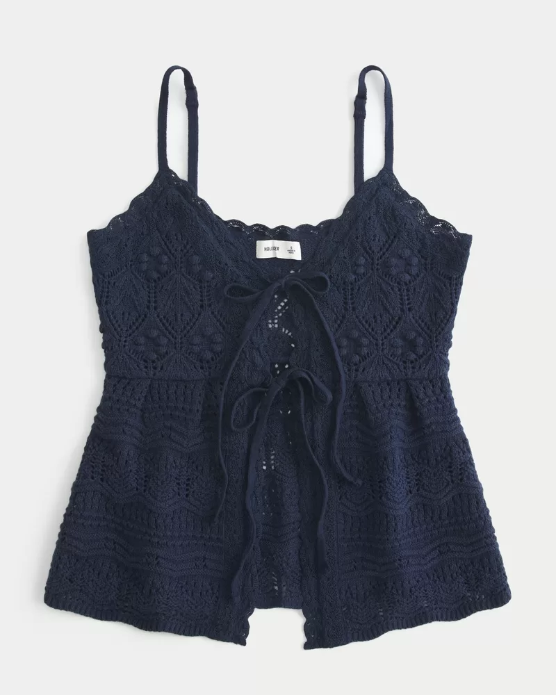 This super soft sweater tank features pretty crochet-style patterns and a tie-front closure. Adjustable straps, v-neckline. Slim Fit. Imported.