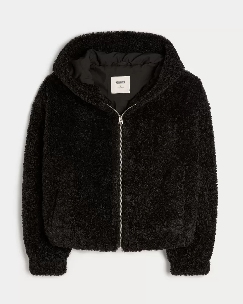 A cute and cozy jacket in curly faux fur with a zip-up closure and hood. Banded cuffs, pockets, fully lined, interior pockets. Imported.