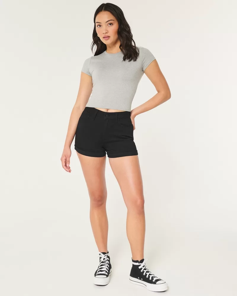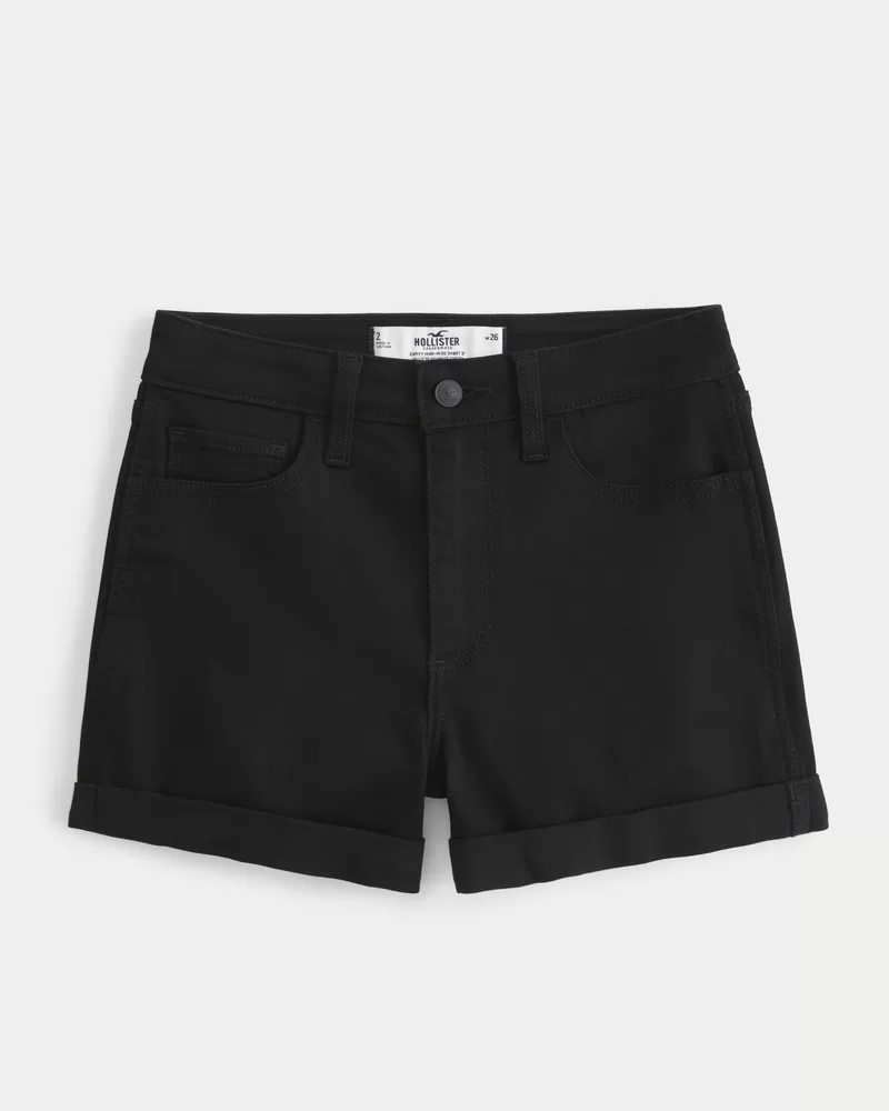 Black denim shorts in Advanced Stretch denim with double-rolled cuffs. High-rise waist, 3″ inseam. Imported.
