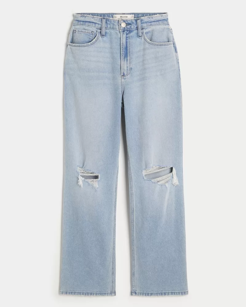 Designed with an ultra high-rise waist and relaxed leg. Vintage Stretch denim in a light wash with fading, whiskering and ripped details. Imported.