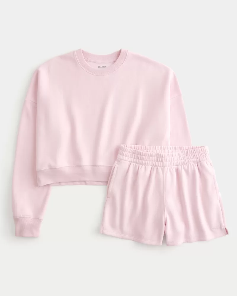 Includes a super soft fleece sweatshirt and fleece shorts designed with a banded ultra high-rise waist. Easy Fit sweatshirt. Imported.