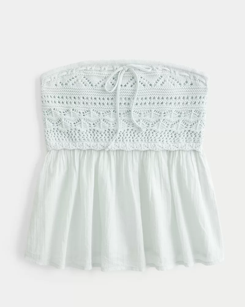 This strapless babydoll top features a crochet-style bust, crinkle voile skirt and smocked back for comfort. Passementerie detail along the neckline detail adds a touch of elegance. Easy Fit. Imported.