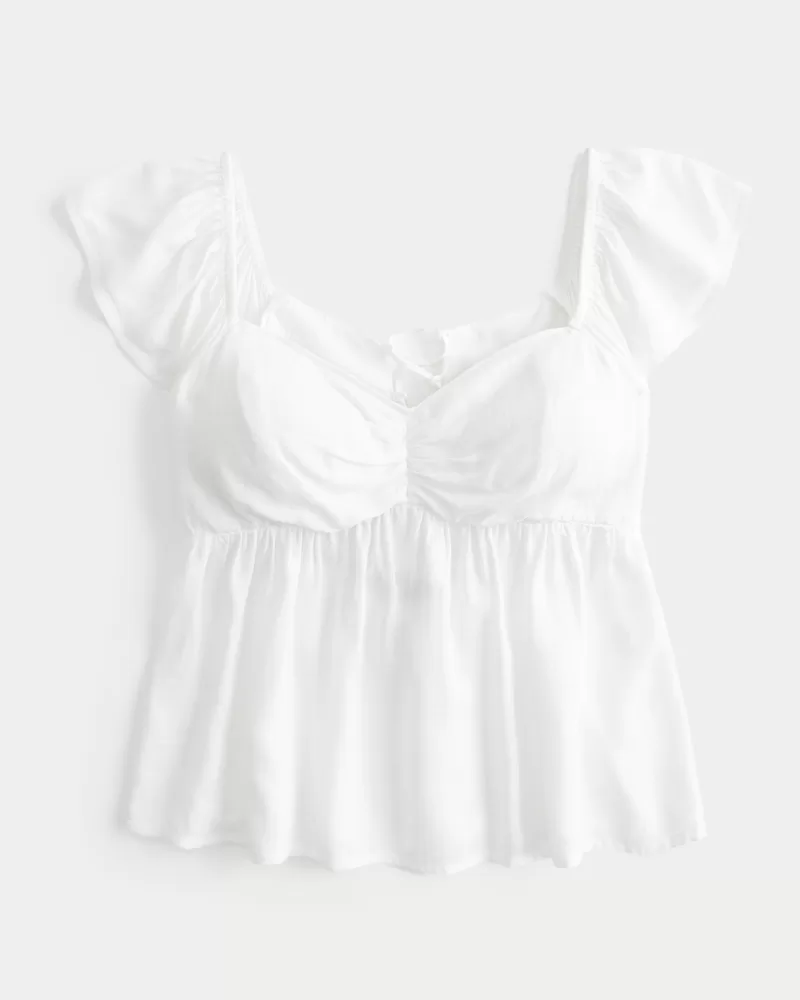 Your new fave top is designed with a babydoll silhouette, flutter sleeves and a lace-up open back. Built-in bust pad details, flowy hem. Easy Fit. Imported.