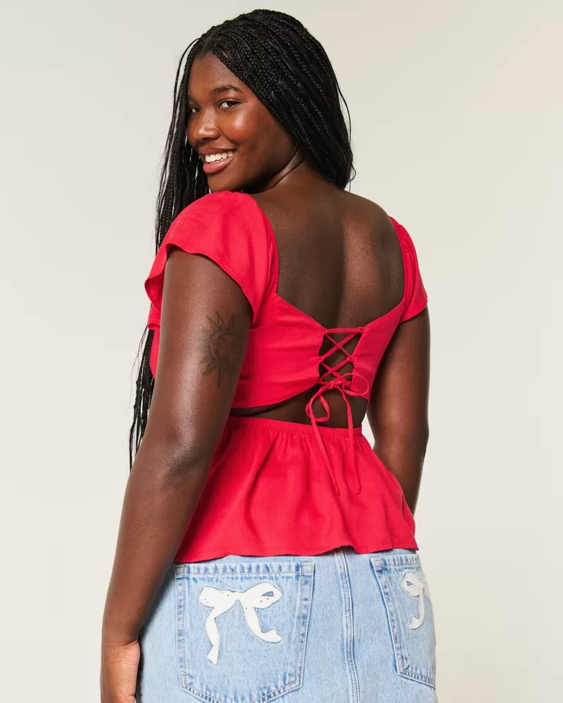 Your new fave top is designed with a babydoll silhouette, flutter sleeves and a lace-up open back. Built-in bust pad details, flowy hem. Easy Fit. Imported.
