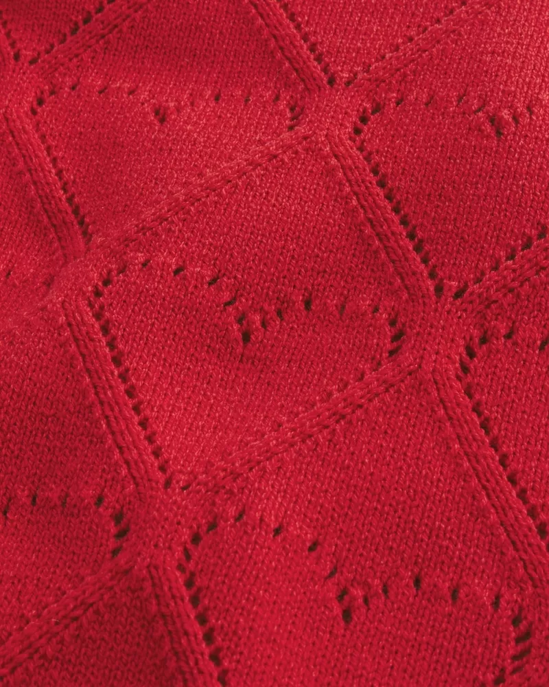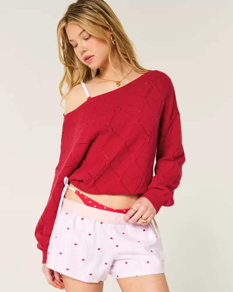 Cozy and super soft, this sweater features Valentine’s Day-inspired stitchy heart patterns. Relaxed neckline can be worn off one shoulder, ribbed trims, long sleeves. Easy Fit. Imported.