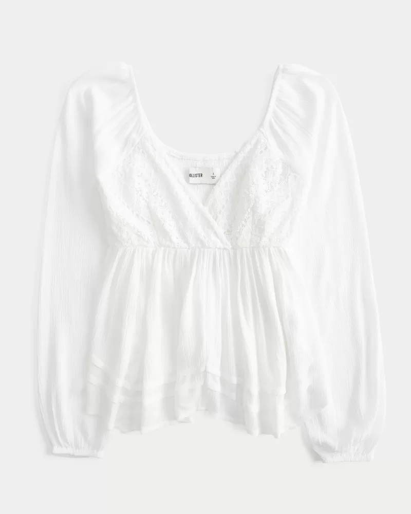 Pretty and super soft, this long-sleeve top is designed with a babydoll silhouette and lace bust. Handkerchief hem, smocked back. Easy Fit. Imported.