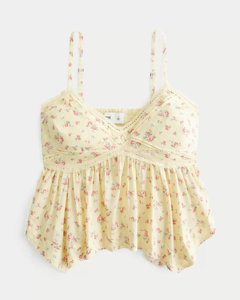 This super cute babydoll top features a handkerchief hem, pintuck details and lace trim. Smocked back for comfort, v-neckline, skinny straps. Easy Fit.