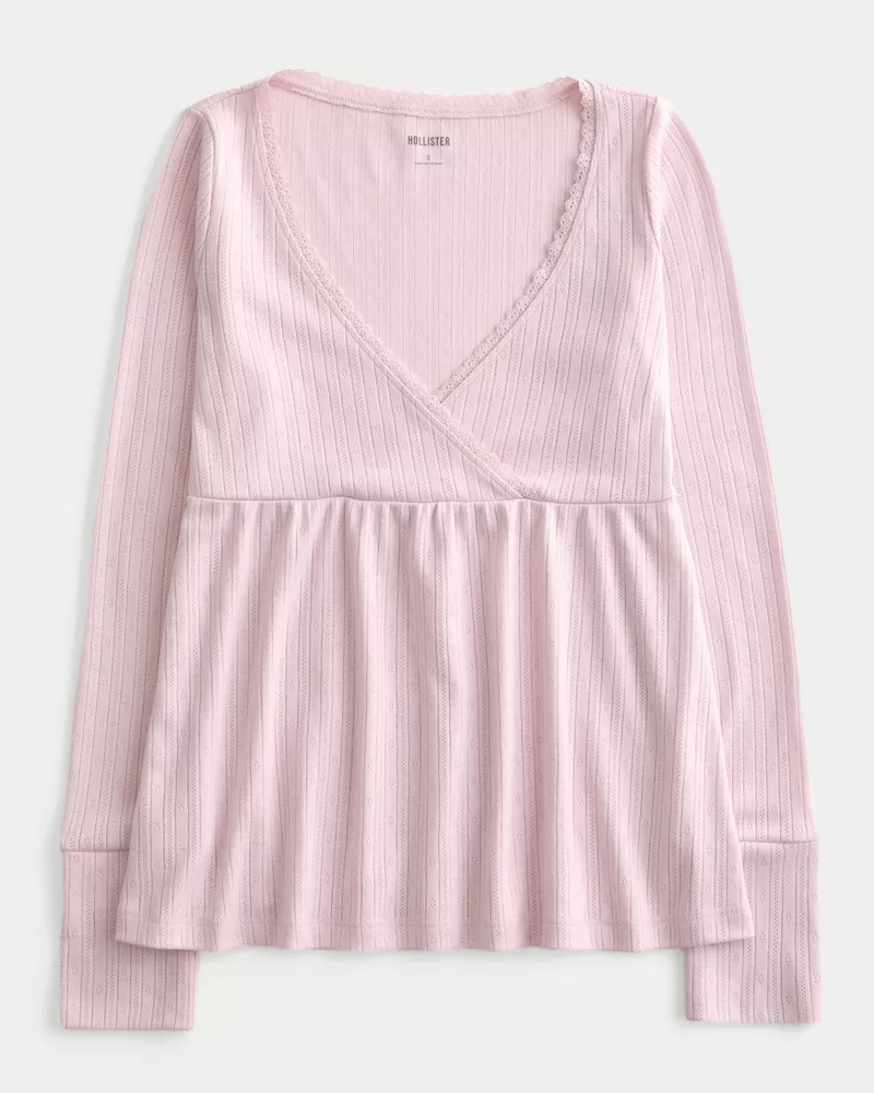 Flowy and super soft, this longs-sleeve top is made with textured pointelle fabric. Wrap-style v-neckline with pretty lace trim, flowy hem. Easy Fit. Imported.
