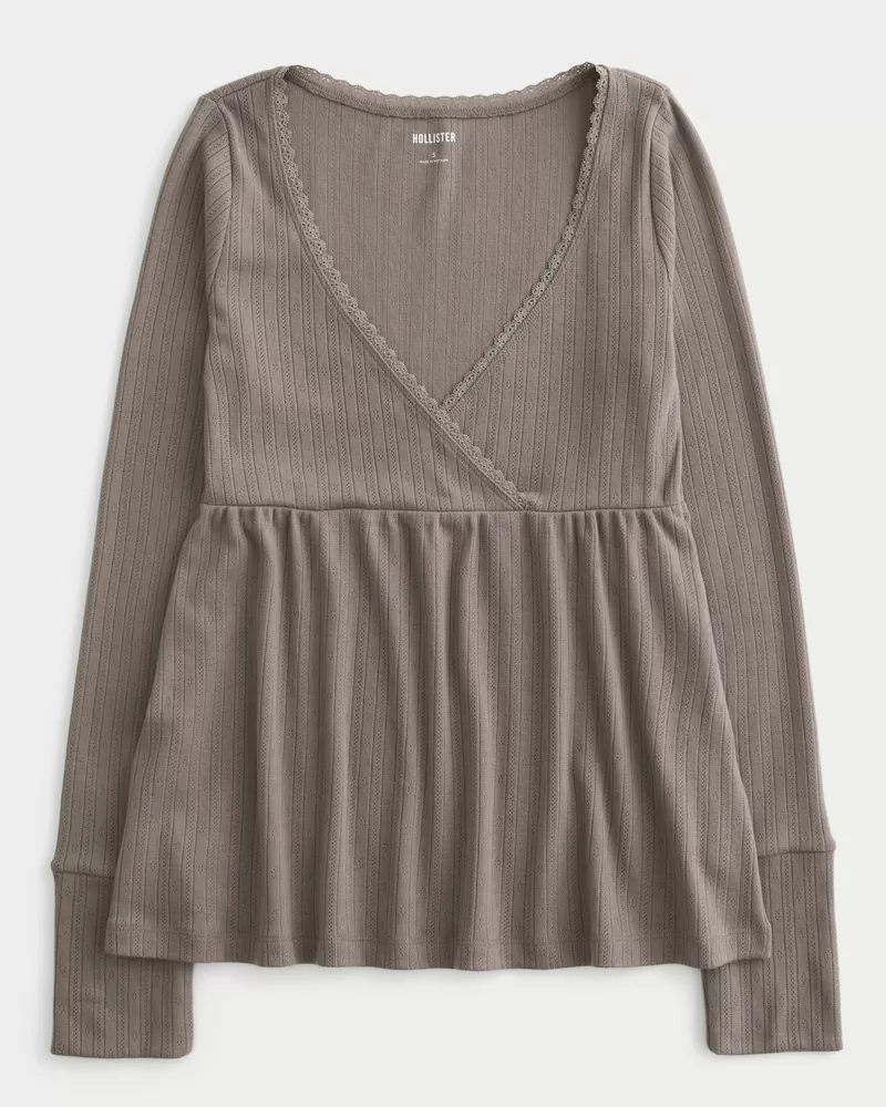 Flowy and super soft, this longs-sleeve top is made with textured pointelle fabric. Wrap-style v-neckline with pretty lace trim, flowy hem. Easy Fit. Imported.