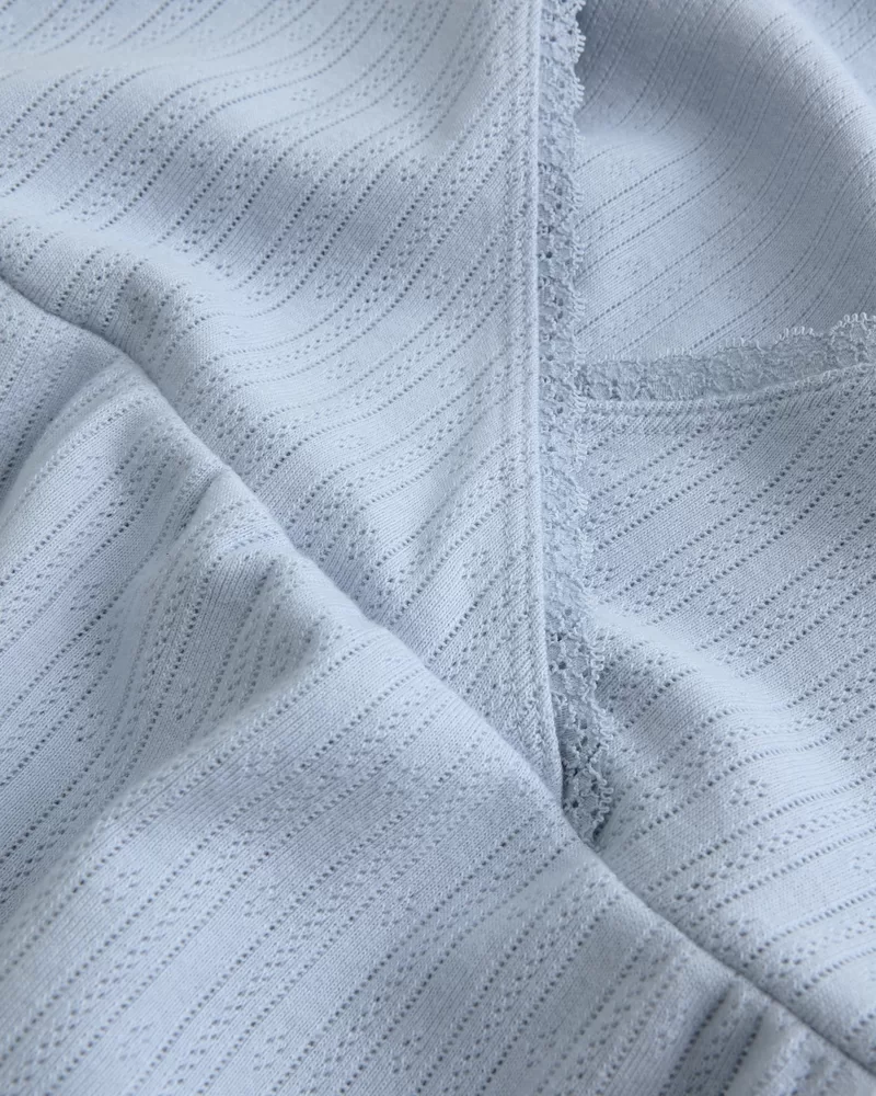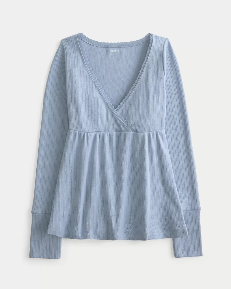 Flowy and super soft, this longs-sleeve top is made with textured pointelle fabric. Wrap-style v-neckline with pretty lace trim, flowy hem. Easy Fit. Imported.