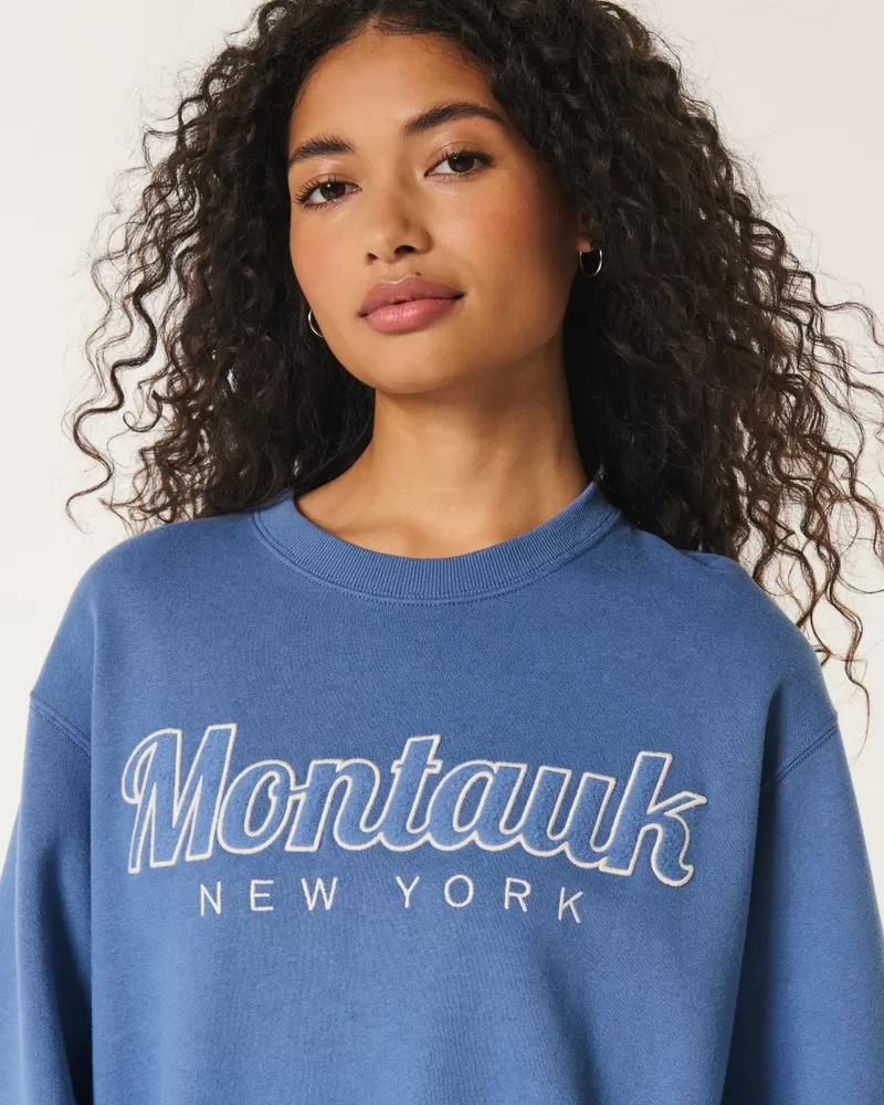 A super soft fleece sweatshirt featuring Montauk New York graphic applique and embroidery, a crew neckline and long sleeves. Easy Fit. Imported.