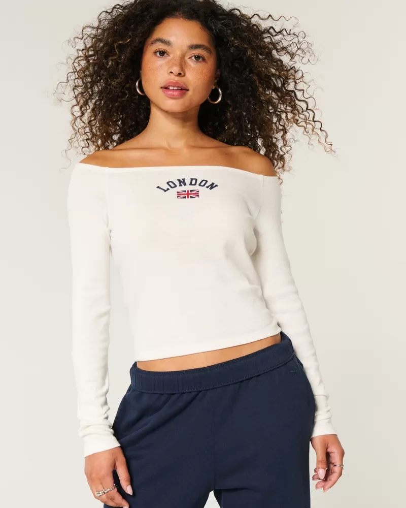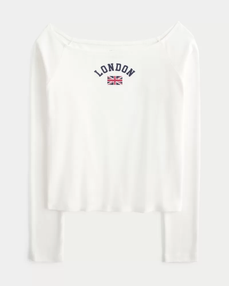 A super soft long-sleeve tee featuring an off-the-shoulder neckline and London print graphic. Easy Fit. Imported.