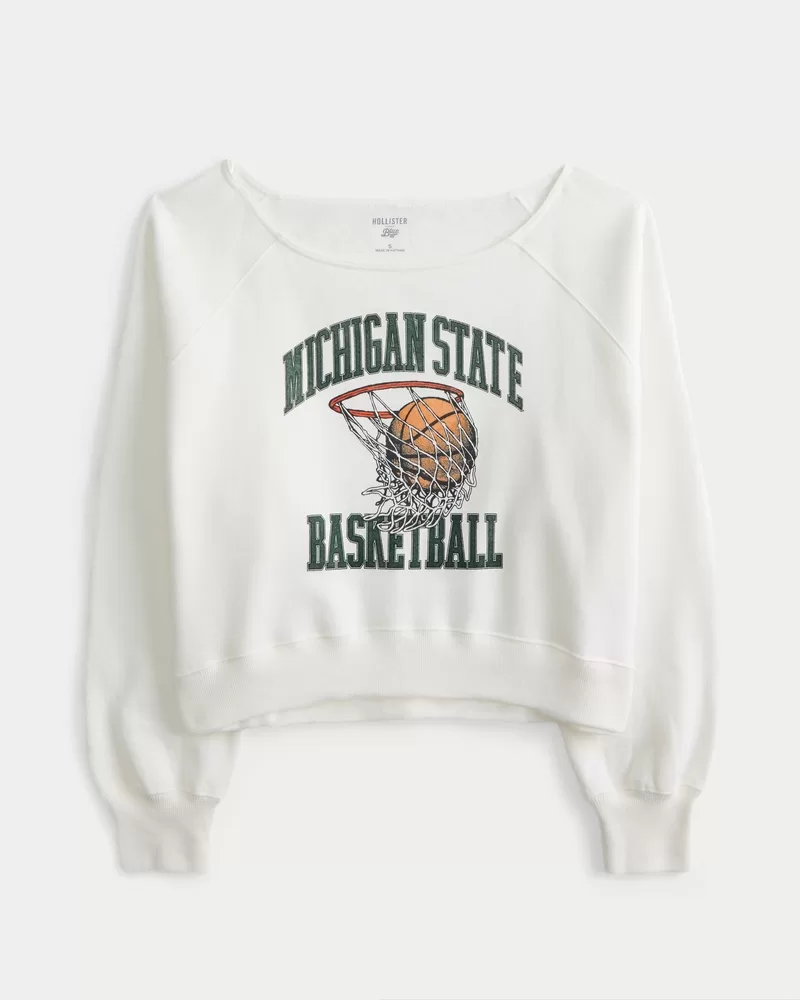 This super soft fleece sweatshirt features official licensed Michigan State Basketball print graphics and an off-the-shoulder neckline. Long sleeves. Easy Fit. Imported.