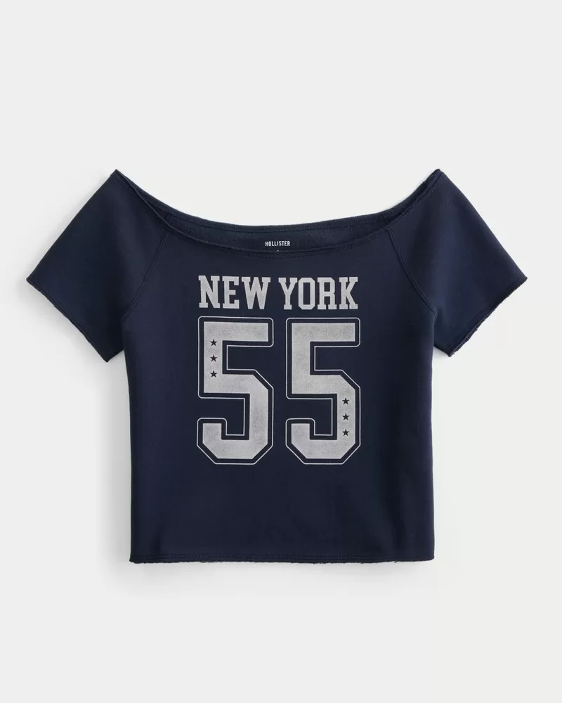 This super soft fleece sweatshirt is designed with short sleeves and an off-the-shoulder neckline. Sporty New York print graphic. Easy Fit. Imported.