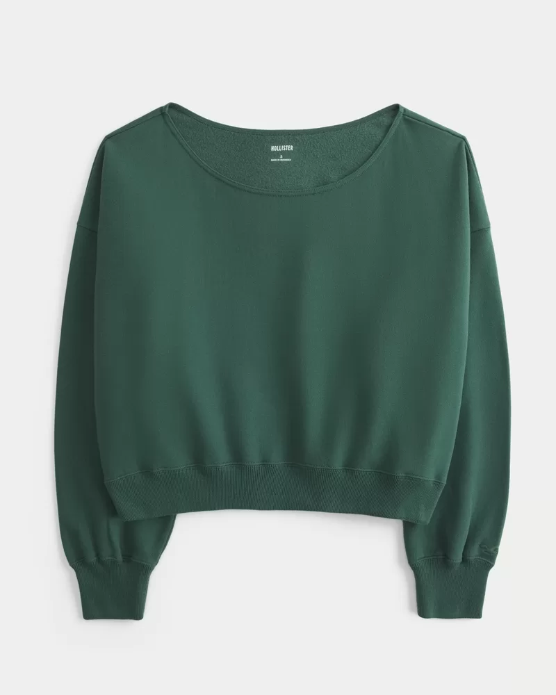 A cozy and super soft fleece sweatshirt with an off-the-shoulder neckline. Long sleeves. Easy Fit. Imported.