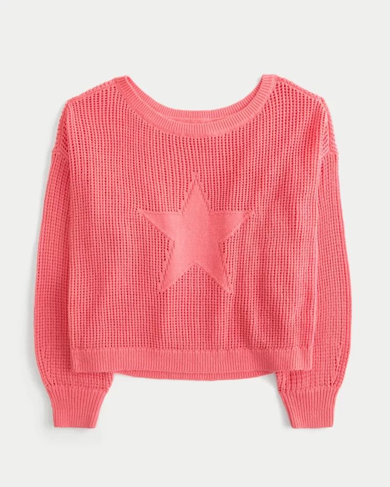 Cozy and super soft, this sweater is made with stitchy textured fabric and features a star graphic. Slouchy neckline can be worn off one shoulder. Ribbed trims, long sleeves. Easy Fit. Imported.