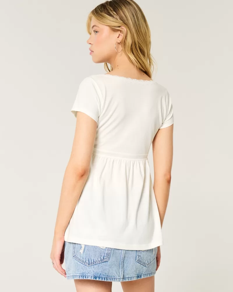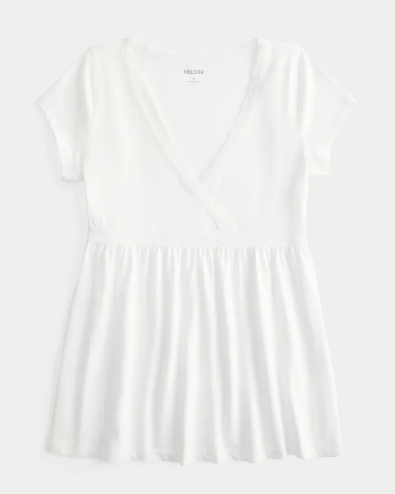 A cute and super soft babydoll top featuring a wrap-style v-neckline with lace trim. Short sleeves, flowy hem. Easy Fit.