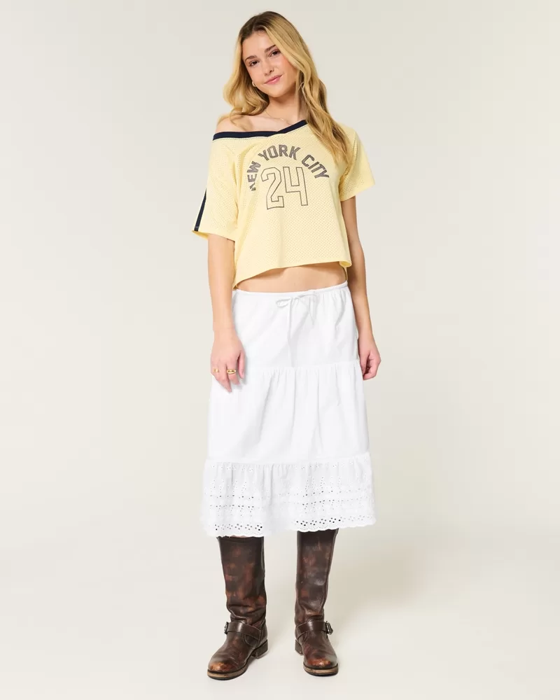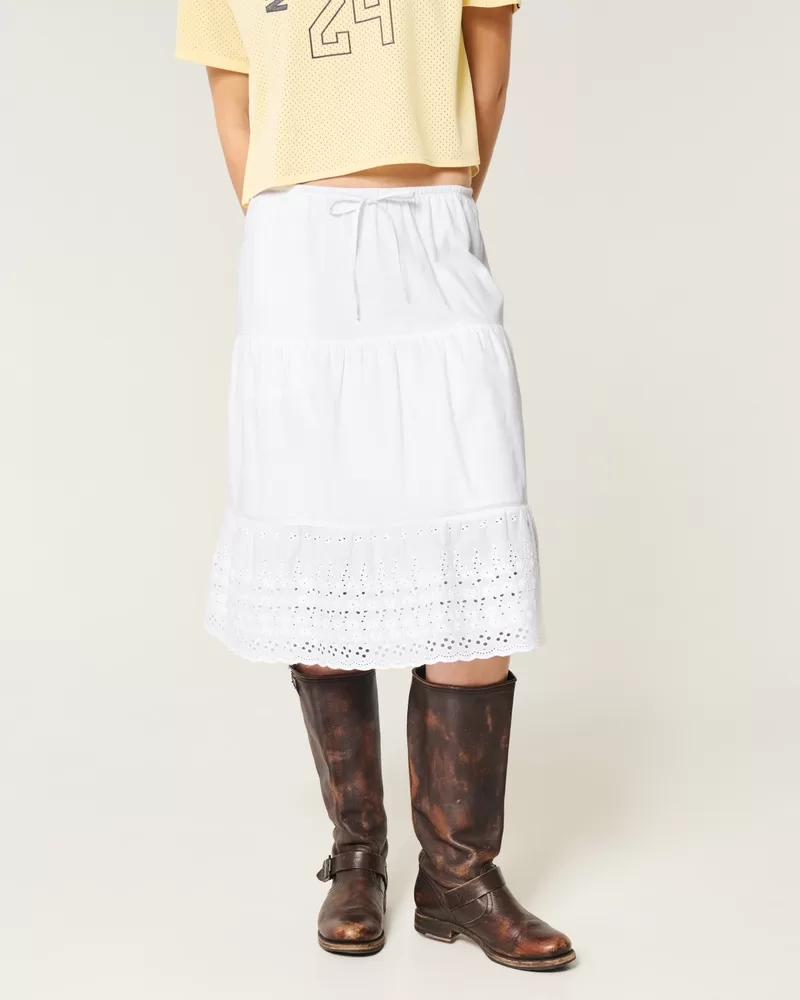 Flowy and super soft, this maxi-length skirt features an adjustable-rise drawstring waist and schiffli hem with pretty eyelet embroidered details. Pockets.