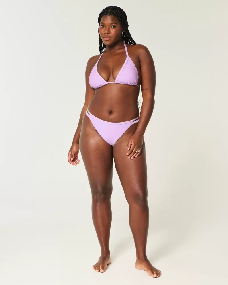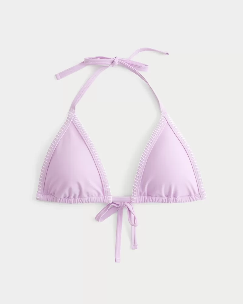 A cute and comfy triangle bikini top made with soft swim fabric, featuring a tie back closure, halter straps, removable pads and embroidered stitch trim.