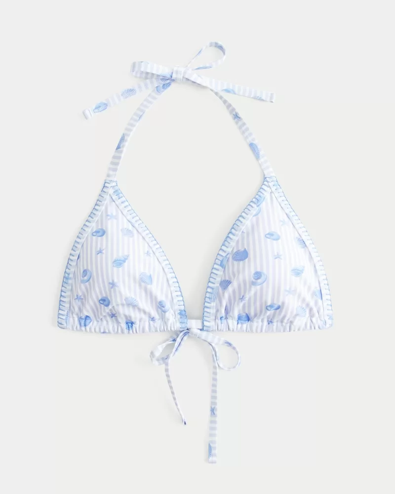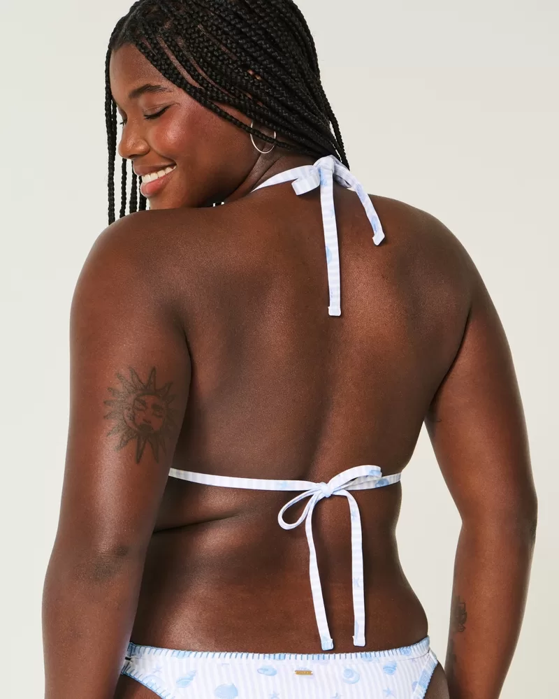 A cute and comfy triangle bikini top made with soft swim fabric, featuring a tie back closure, halter straps, removable pads and embroidered stitch trim. Imported.