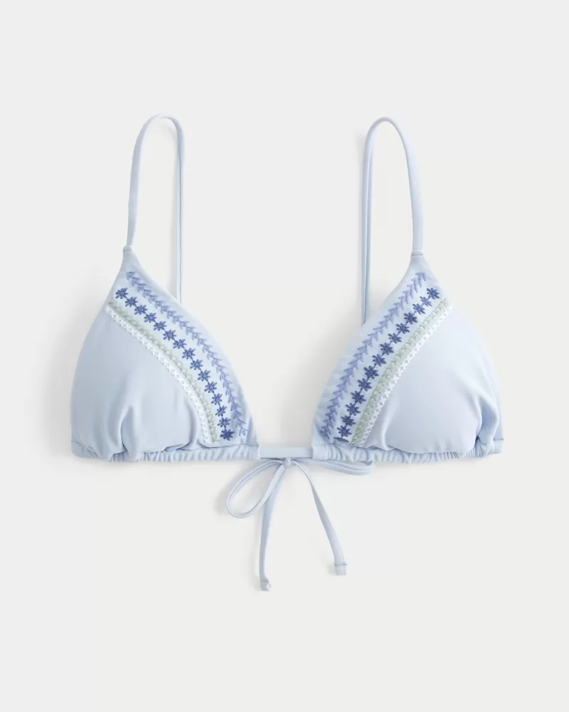 This cute and comfy bikini top is designed with a triangle silhouette and a tie-back closure. Removable padding, embroidered stitching details. Imported.