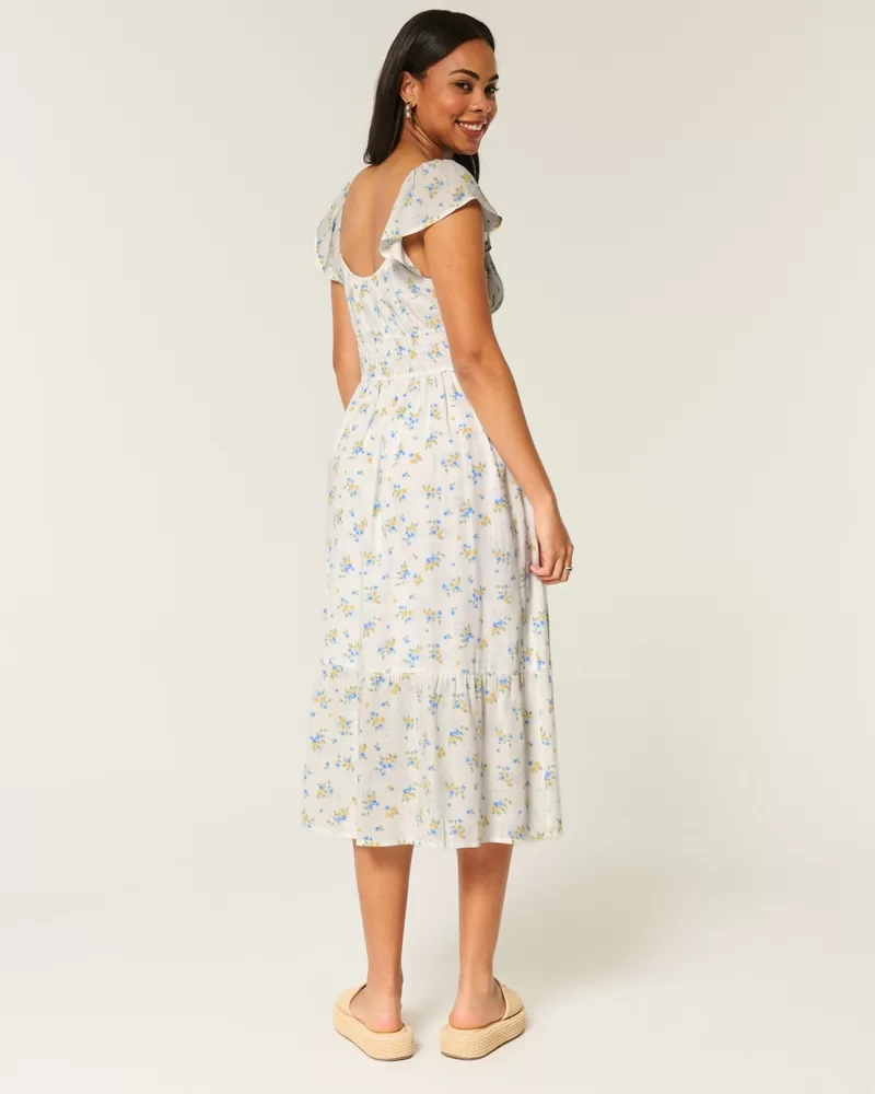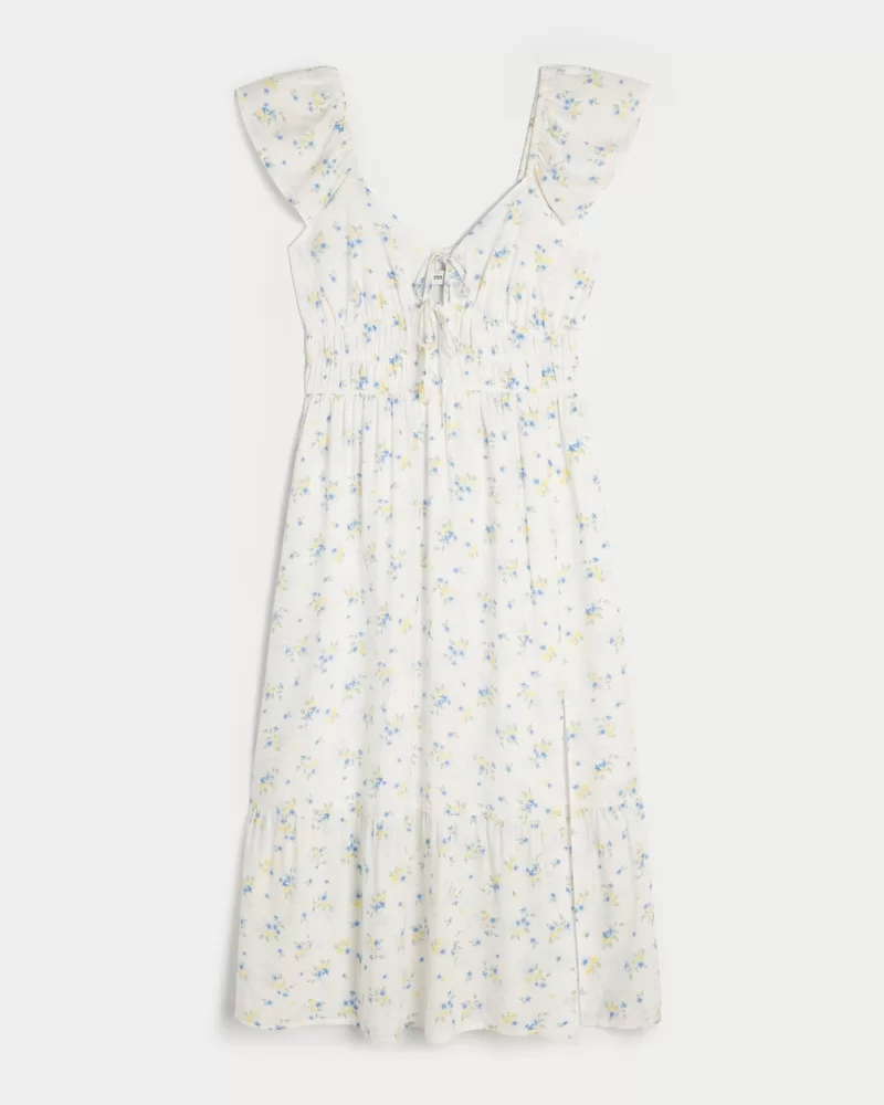 Pretty and super soft, this midi-length dress has flutter sleeves, pockets and a front tie detail. Channeled waist with double ties. Imported.