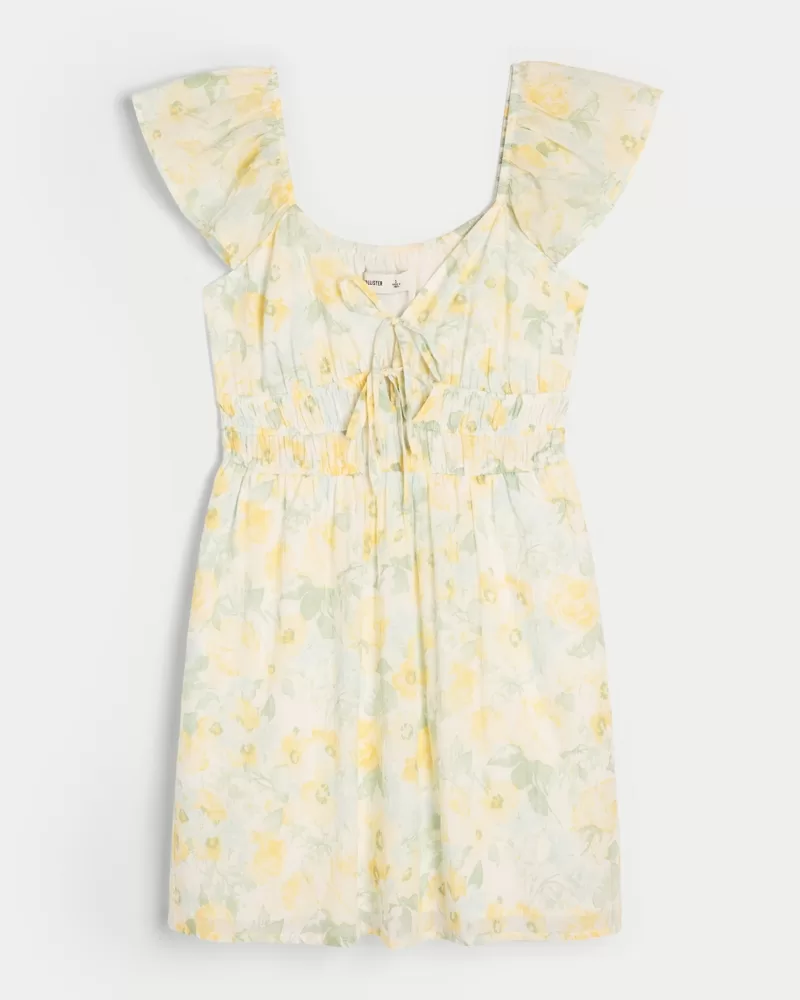 Pretty and super soft, this skort dress has flutter sleeves, pockets and a front tie detail. Hidden bathroom-friendly shorts, channeled waist. Imported.
