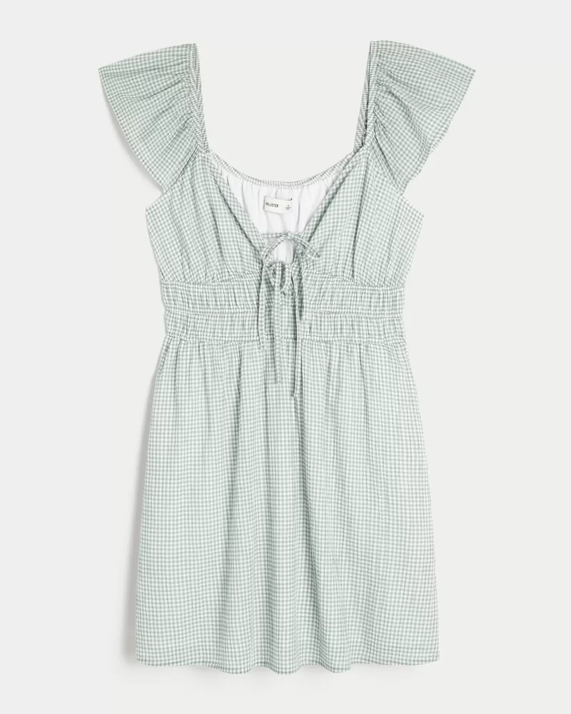 Pretty and super soft, this skort dress has flutter sleeves, pockets and a front tie detail. Hidden bathroom-friendly shorts, channeled waist. Imported.