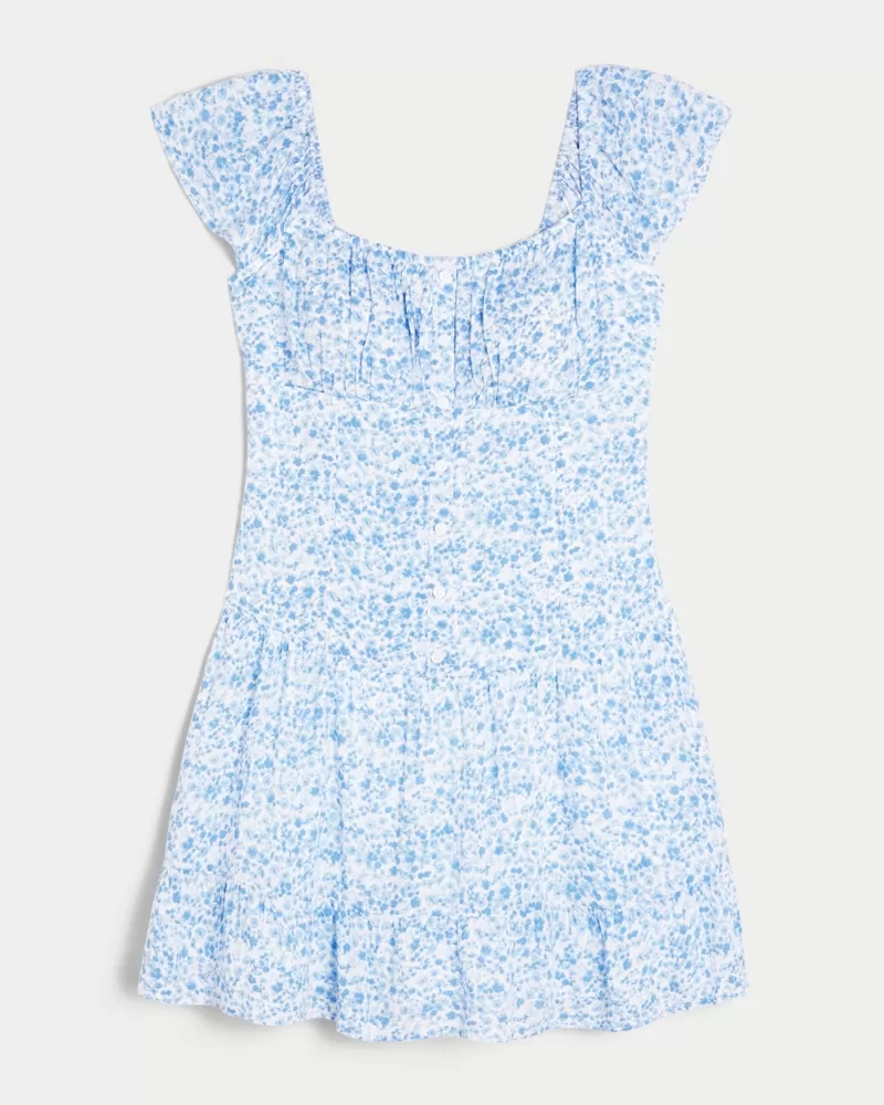 Pretty and super soft, this dress features ruched detailing through the bust, flutter sleeves and center button details. Flowy skirt, hidden shorts. Imported.