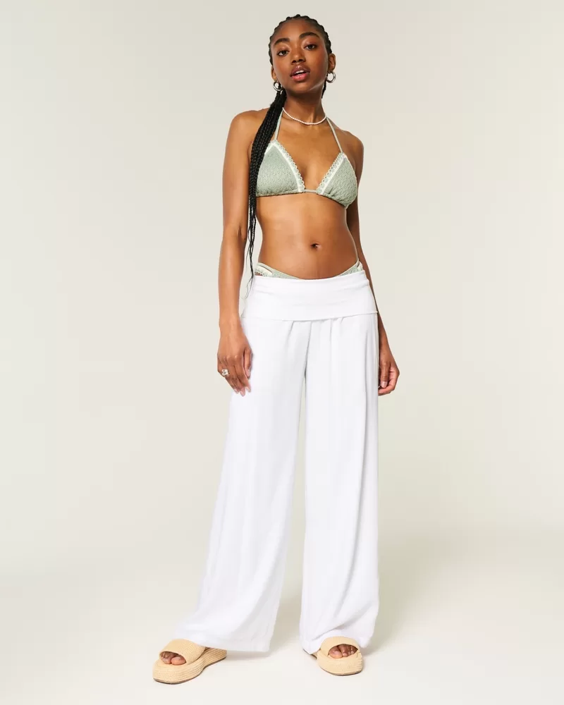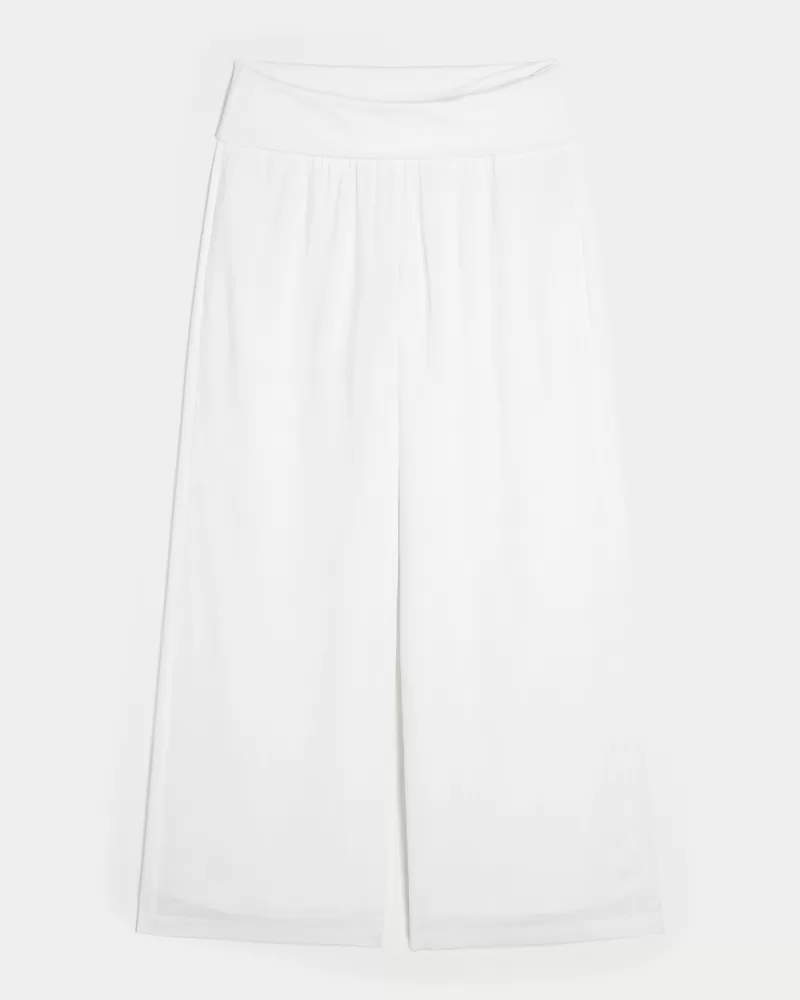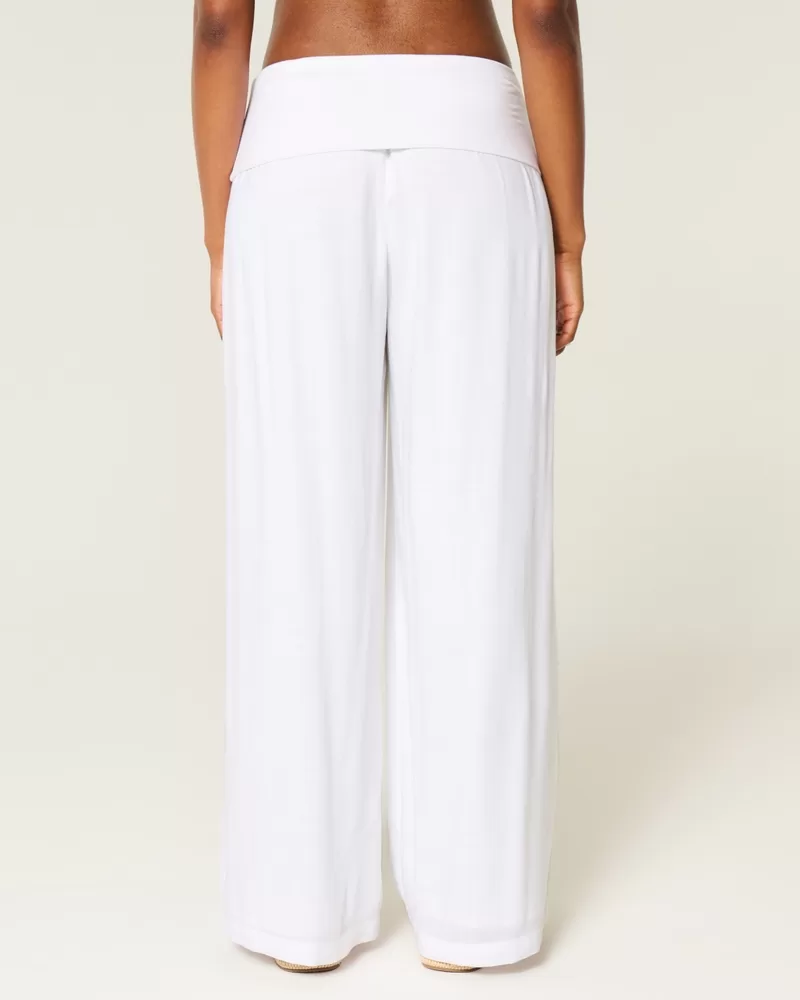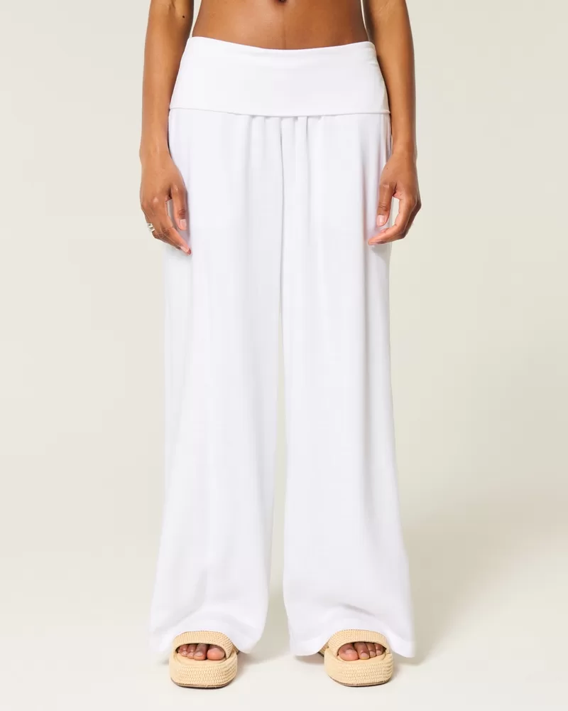 Comfy and super soft pants in slubby fabric, designed with a foldover waist and super baggy leg. Pockets. Imported.
