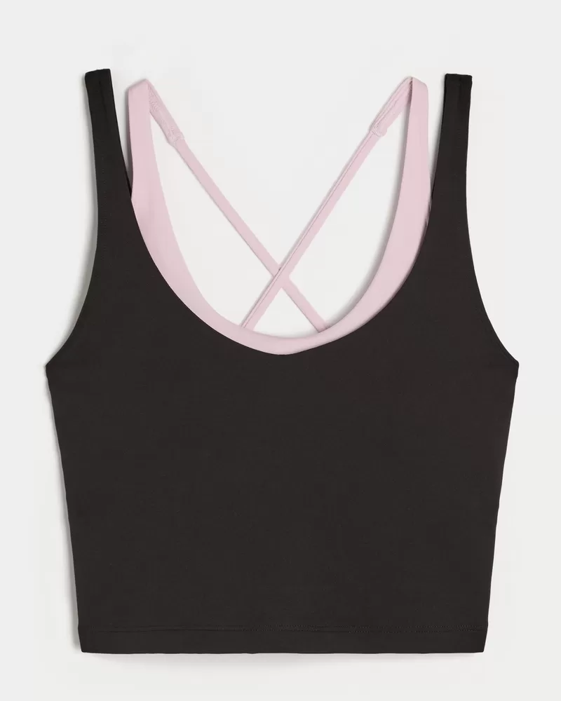 Designed in our breathable, 4-way stretch, moisture-wicking Boost fabric with a super soft, brushed feel. Layered detail with cross-back straps. Built-in bra with removable pads. Imported.